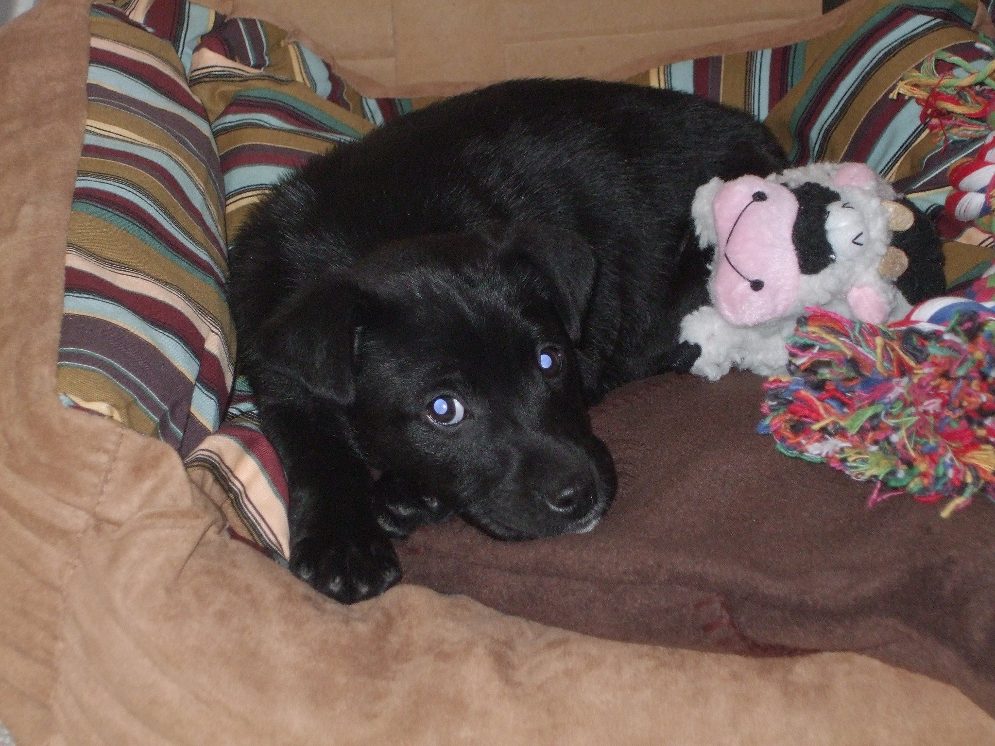 Lucas’ first night with us was his calmest, I think. He’d been separated from his mother and two sisters, picked up by a big stranger and driven nearly an hour down winding, Shropshire roads to a place he’d never seen. The journey was smooth, I thought, because he didn’t make a peep. I even stopped once to make sure the bundle was still breathing. I brought him inside, and laid inside his crate with him while he slept, snuggled up against his fleecy hot water bottle. (I think, on reflection, that the adult lab-sized crate was slightly over-kill for a foot-long pup). I’m thinking, at this stage: “Hey, this is great! I remember puppies being much more work than this! Must be the breeding.”